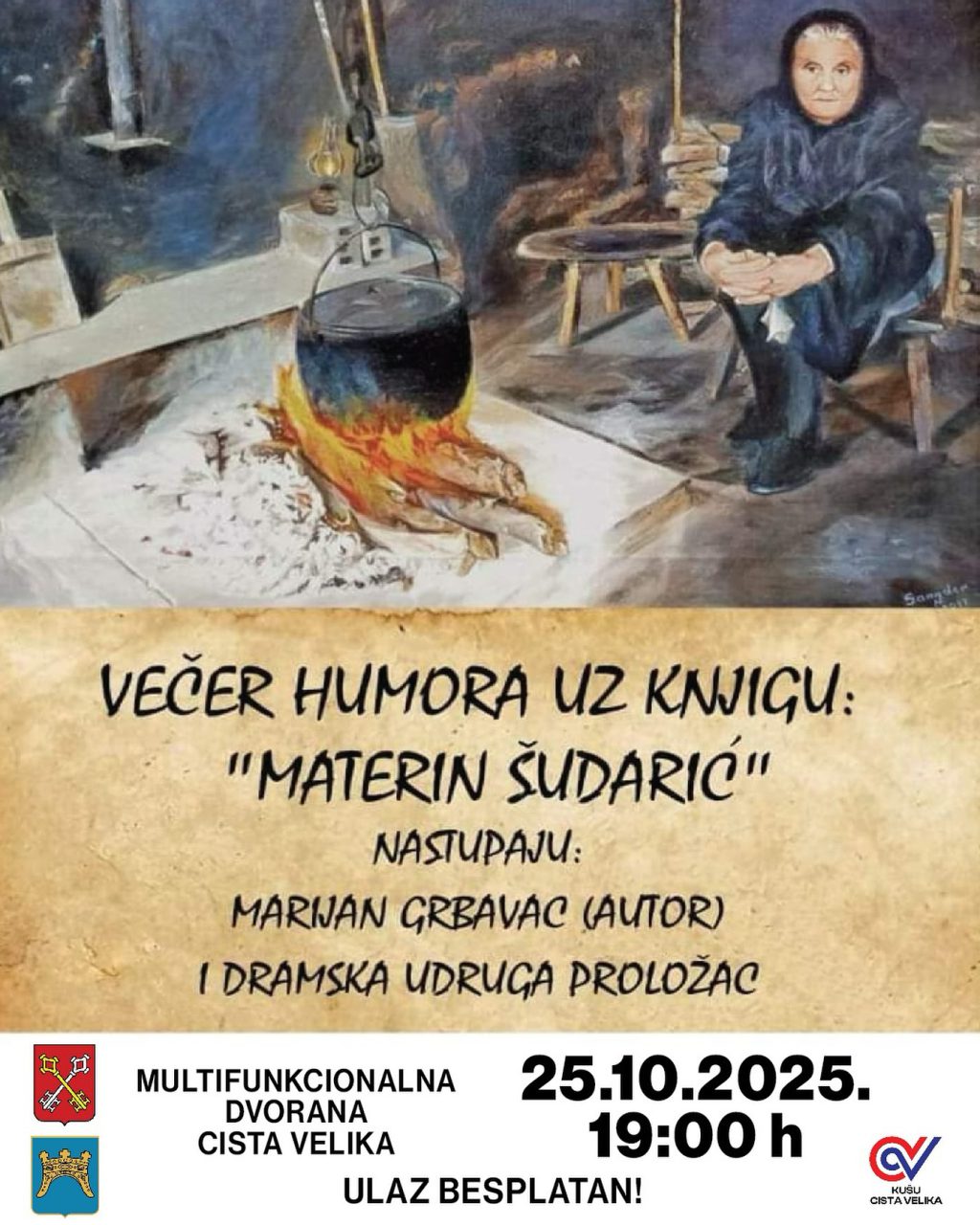 Za sve koji ovi vikend traže malo odmora i humora predlažem predstavu Večer humora uz knjigu: “Materin šudarić” koja će se održati u subotu 25.10.2025. u 19.00 sati u Multikunkcionalnoj dvorani u Cisti Velikoj.