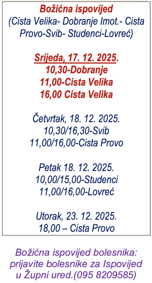 Božićna ispovid u Dobranjama će biti u sridu 17. prosinca 2025. u 10.30 sati.