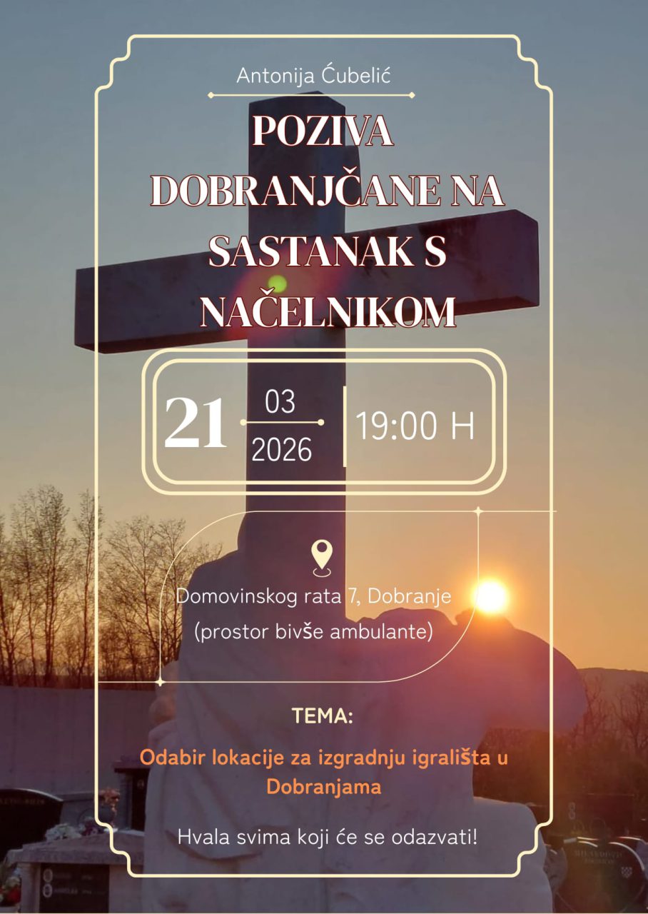 Sprovod će biti u ponediljak 2. veljače 2026. u 14.00 sati na mjesnom groblju u Dobranjama.